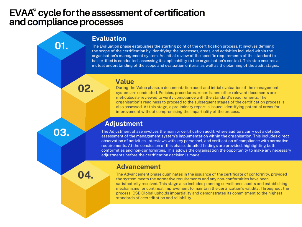 It is important to note that the accreditation service provided by CSB Global does not replace or equate to the validation of compliance with international standards, such as those established by the International Organization for Standardization (ISO). For more information on management system certification, please, click here.